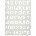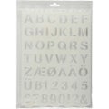 Muovisabloni kirjaimet, numerot ja symbolit sisältää kirjaimet A:sta Ö:hön sekä numerot 0-9. Lisäksi sablonissa on erikoismerkkejä.