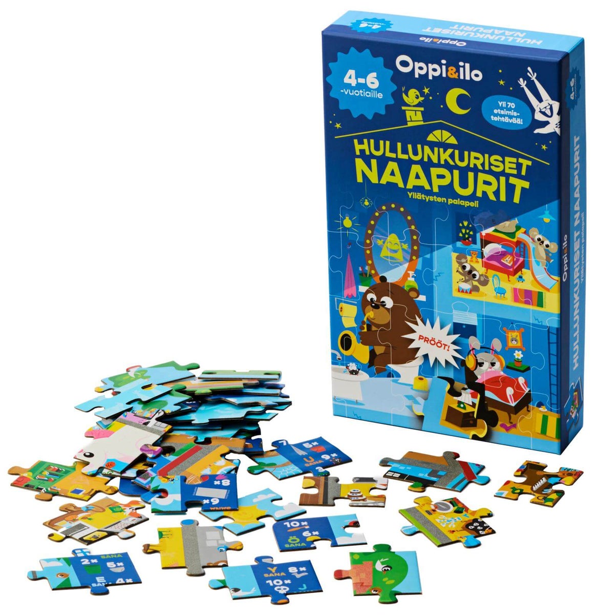 Yllätysten palapeli viihdyttää pitkään! Oppi&ilo Hullunkuriset naapurit on valloittava 100 palan palapeli täynnä tutkittavaa ja etsittävää. Eläinperheiden talo on täynnä hullunkurisia tilanteita. Miksi katosta pölisee laastia? Kenen vessassa törisee? Kuka on haukannut palan herkkukakusta?